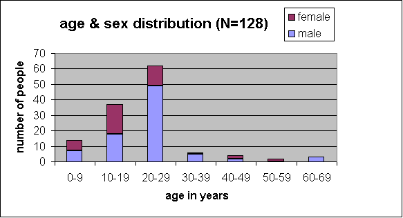 AGE % - 5 5.5 below school age 5-16 7.0 attending school 16-17 7.0 18-25 56.3 25- 24.2 ----- 100.0% (data from children included)